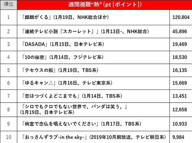 2020年1月13日 1月19日 ドラマ視聴熱 視聴率top10 視聴熱1位は 麒麟がくる 視聴率1位は スカーレ ニコニコニュース
