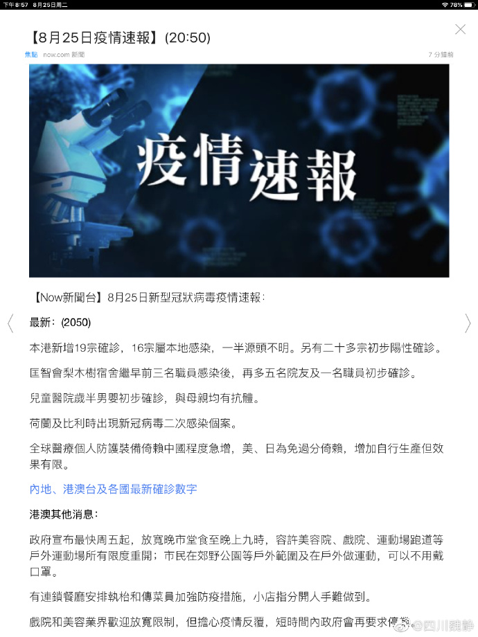 大纪元2020年08月28日讯 截至27日零时零分 香港 新增21宗中共病毒 武汉肺炎 确诊个案 本地个案占18宗 累计4 756宗确诊 新增本地的个案中. 抗击新冠肺炎 香港新增8宗确诊个案 旺角维景酒店两名同层住客确诊 中新社香港9月2日电 记者 张晓曦 香港特区政府卫生署卫生防护中心2日通报. 抗击新冠肺炎 香港新增8宗确诊个案 旺角维景酒店两名同层住客确诊 中新社香港9月2日电 记者 张晓曦 香港特区政府卫生署卫生防护中心2日通报 截至2日零时 香港新增8宗新冠肺炎确诊个案 全部为本地感染个案 其中2宗涉及曾住在旺角维景酒店同层的两名住客.